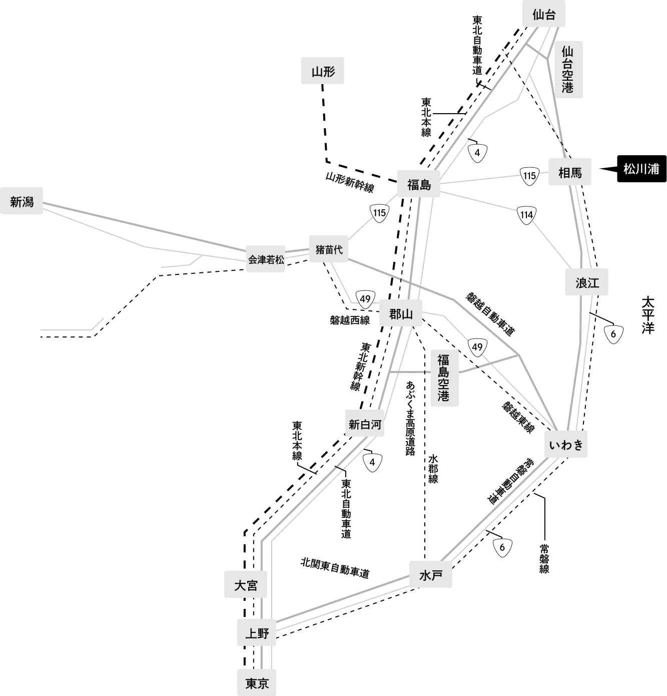 - JR常磐線「相馬駅」が最寄りです。仙台方面からは約1時間、いわき方面からは約2時間でアクセス可能です。相馬駅から松川浦までは直通の公共交通機関が限られているため、タクシーやレンタカーの利用が一般的です。所要時間はおよそ15分ほど。